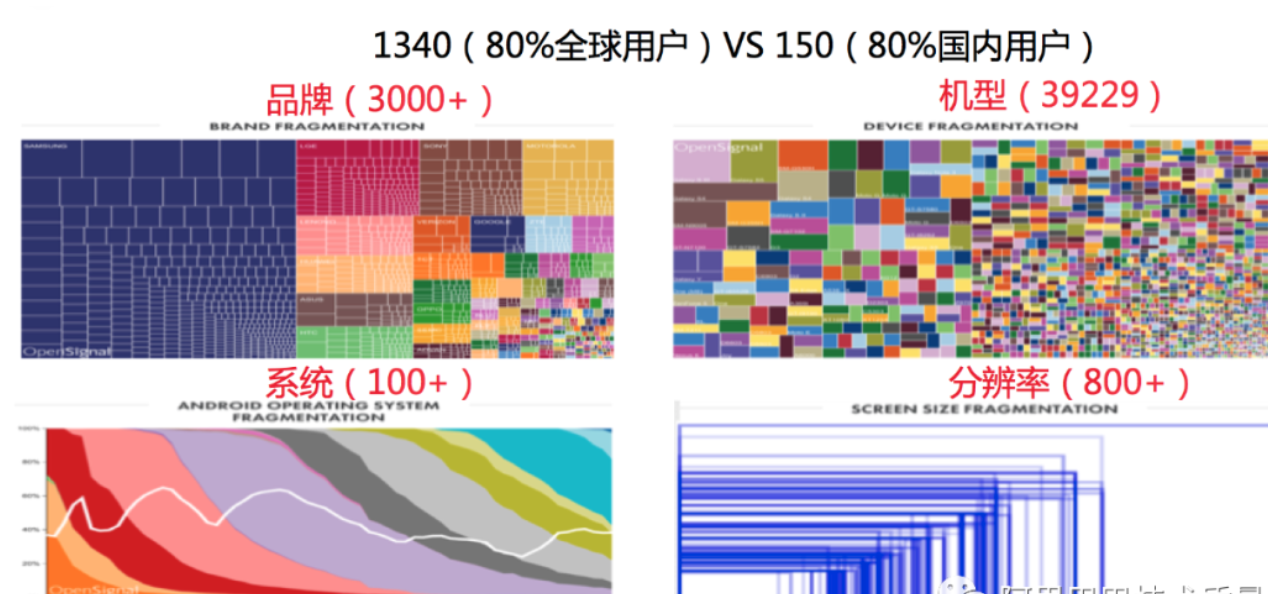 - 海外测试仿真度低:全球化用户遍布全球各地,质量同学想要真实模拟不同地区的用户的真实体验挑巨大,海外用户手机适配的挑战也将远远大于国内。且语言类特有的漏翻\错翻\文案截断问题在UI层的问题突出,而当前手工程度高,问题发现能力弱。与此同时可以预见,若扩充到其他语言时工作量会成倍增加。如下是全球用户在品牌、机型、系统和分辨率上的差异。