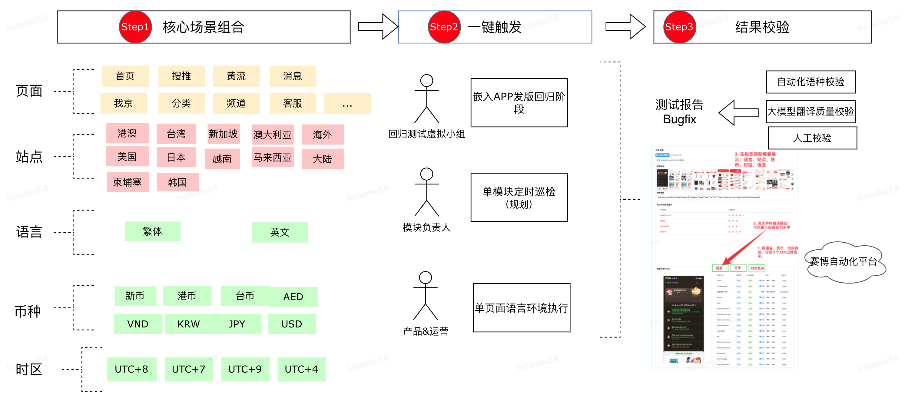 | 发版回归 | 一键触发自动化巡检 | ·页面 x 语言 x 汇率 x 时区的的测试组合场景,进行高效执行和批量验证。 http://cyber.test.jd.com/#/autotest/i18nAutomation·长期规划:一键报Bug、单模块定时巡检、嵌入APP发版回归平台流程、大模型质量翻译嵌入平台。 | |