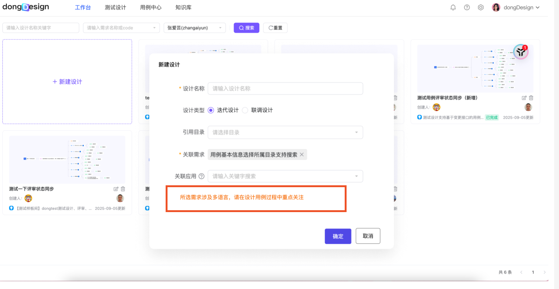 | 创建设计 | 创建设计时给出提醒 | ·选择迭代设计,选择需求后,识别需求的多语言字段 ·若打标为是,则给出黄色区域文案提示: ·所选需求涉及多语言,请在设计用例过程中重点关注 ·不涉及联调设计 | ![]() |