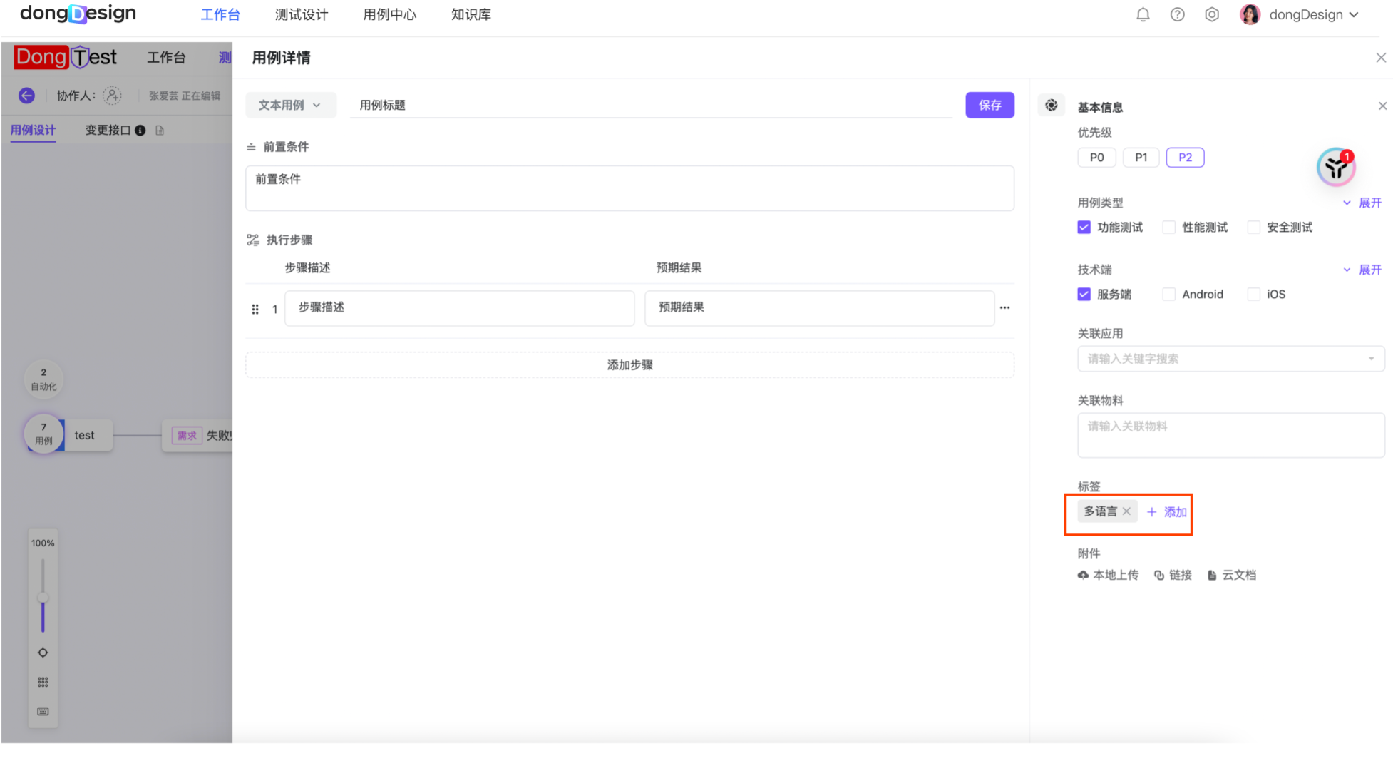 | 用例打标 | 单用例详情页,支持用户打标签 | 多语言系统标签用户点击添加默认推荐出来 | ![]() |