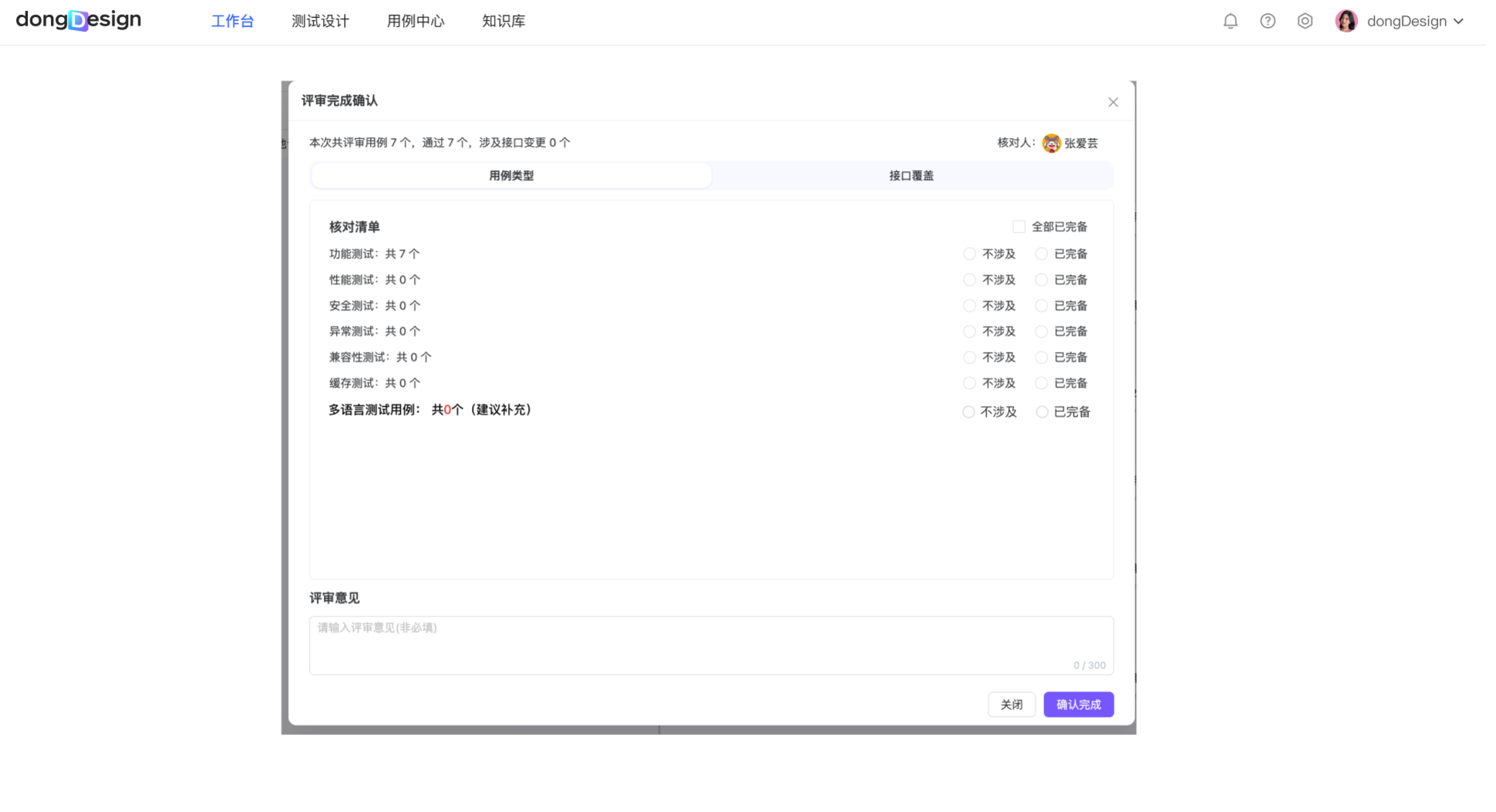 | 用例评审 | 时给出提示提醒 | 点击评审完成时,判断下需求是否有对应标记,若有标记,则增加一个根据标签统计多语言用例的区域,若用例数为0,则0红色高亮显示,并展示建议补充文案 不涉及联调设计 | ![]() |