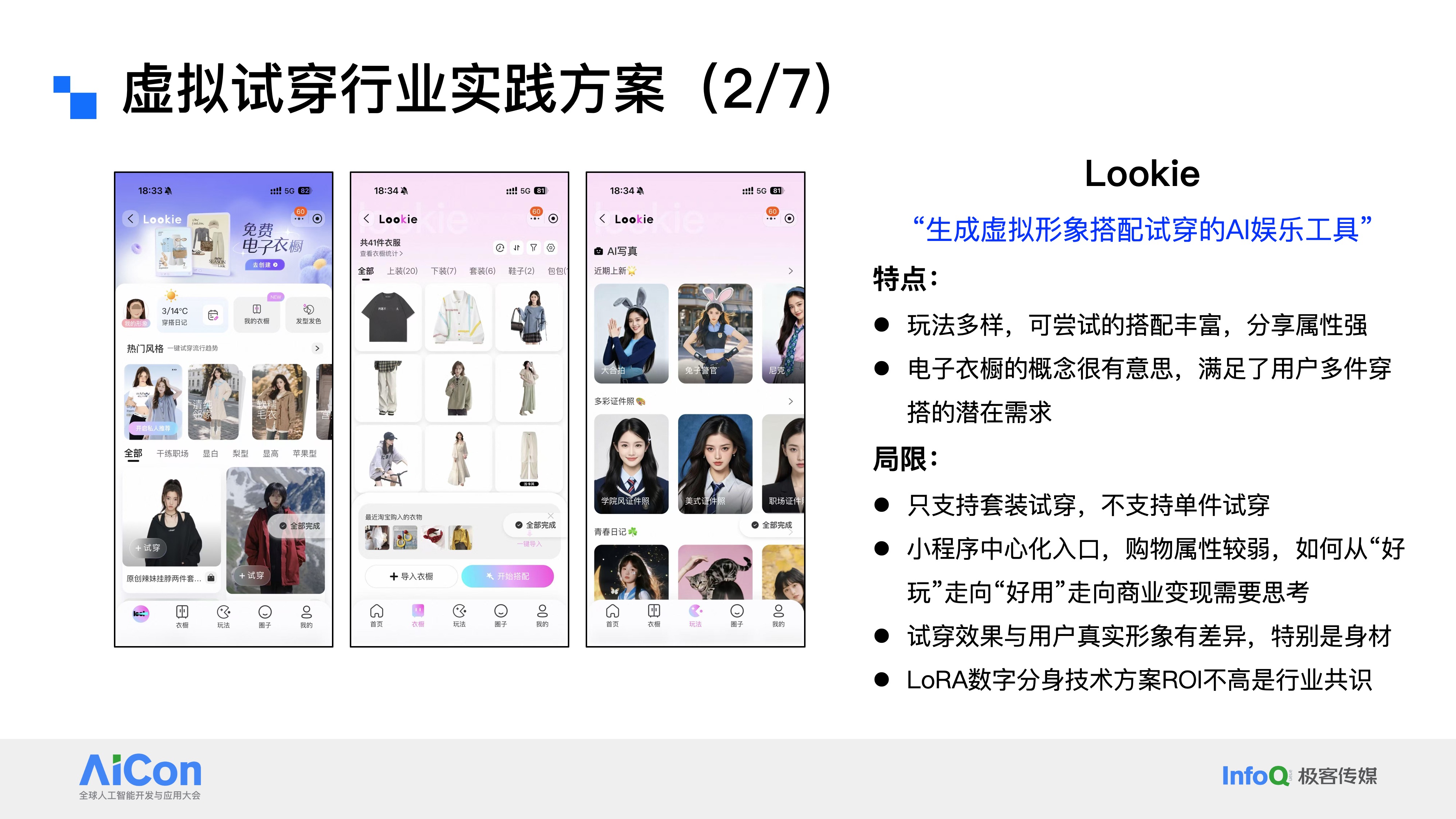 当然,我们也客观地分析一下它当前存在的局限性。第一,Lookie目前仅支持套装试穿,不支持单件试穿。套装试穿在娱乐场景下确实很有吸引力,但电商平台的用户购买行为更多集中在单件服饰,这就形成了一个明显的场景缺口。第二,它作为淘宝的一款中心化小程序,入口相对较深,导致产品的购物属性偏弱。如何从“好玩”迭代到“好用”,最终实现商业变现,是Lookie团队需要重点回答的问题。第三,从试穿效果来看,生成的形象和用户真实身材仍存在一定差异,大家可以去淘宝小程序里亲自体验感受。第四,Lookie的人物形象建模,在一定程度上依赖于LoRA数字分身技术。熟悉这个技术的人应该知道,早期的妙鸭也是这样,需要用户上传十几张个人照片,付费后等待模型训练,才能生成专属数字分身,后续试穿也都基于这个数字分身来完成。但这种技术方案对训练资源的要求较高,算不上是行业内ROI最优的选择。不过值得一提的是,Lookie目前已经开始尝试支持单张图像建模,在降低用户使用门槛上往前又迈出了一步。