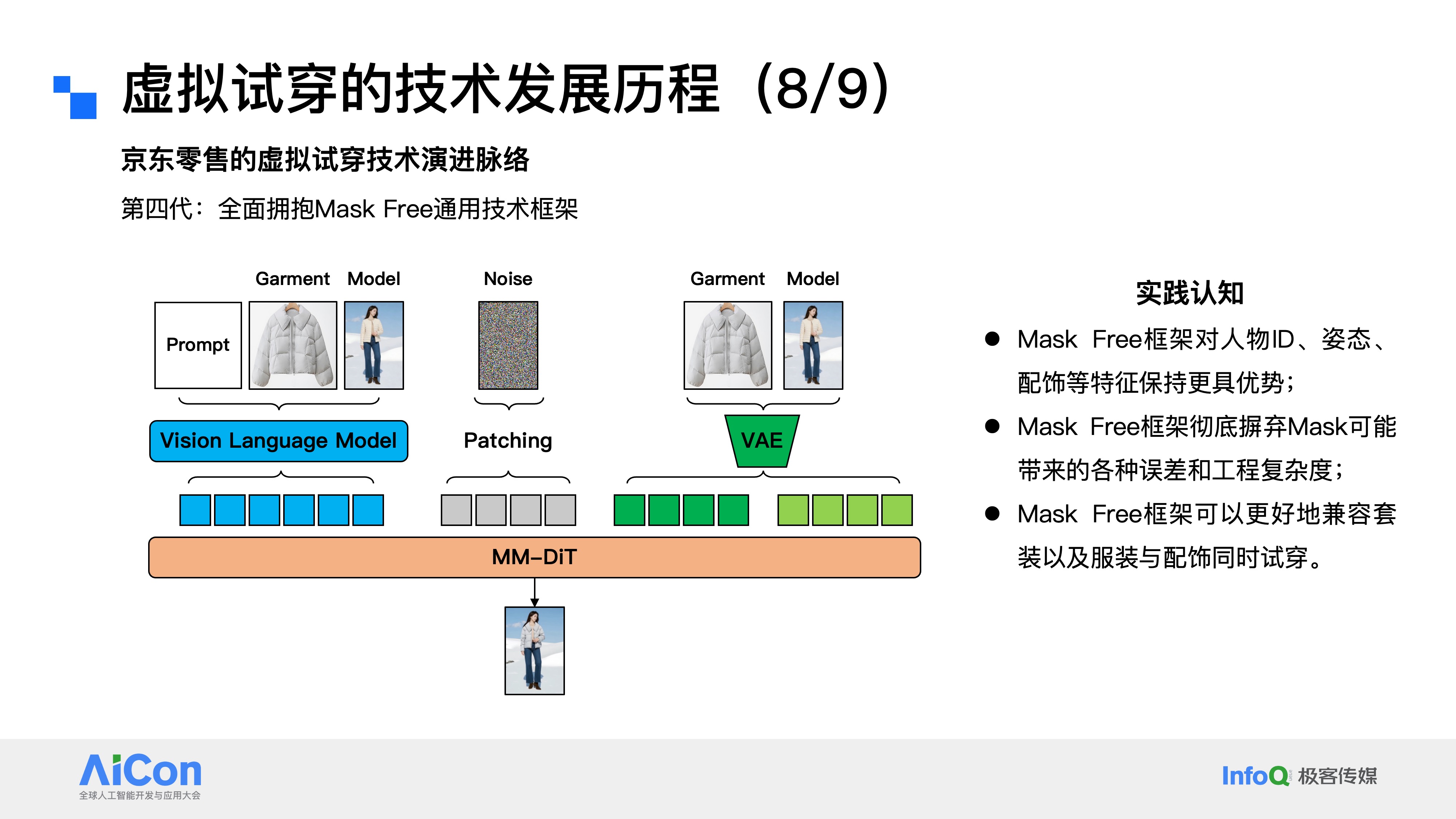 而京东零售最新的第四代虚拟试穿技术,这一代框架最显著的变化,就是完全摒弃了Mask模块,全面拥抱Mask Free的通用技术架构。与此同时,参考图的表征方式也从原来的纯视觉维度,进化为融合文本模态的多模态统一表征,这里我们引入了Vision Language Model 视觉语言模型来专门完成参考图的特征提取。基于第四代框架的实践,我们也沉淀了几个关键认知:第一,Mask Free框架对人物的身份特征、肢体姿态、服饰细节以及配饰元素,都能实现更好的保留效果;第二,该框架彻底摆脱了Mask模块可能带来的误差累积,同时大幅降低了工程研发的复杂度。毕竟从研发角度来说,系统模块越简洁,引入连带问题的概率就越低,而Mask模块本身会因不同应用场景产生各种badcase,容易引发新问题;第三,Mask Free框架可以更好地兼容套装试穿,以及服装与配饰的同步试穿需求。举个简单的例子:在传统Mask方案中,需要先mask掉用户原有的衣物,再叠加新服饰,可如果用户原本还斜挎着小包,这个包包大概率会随旧衣被mask掉,相当于破坏了用户的原始信息,而通过Mask Free的技术框架,就能实现“新衣上身,配饰保留”的效果。