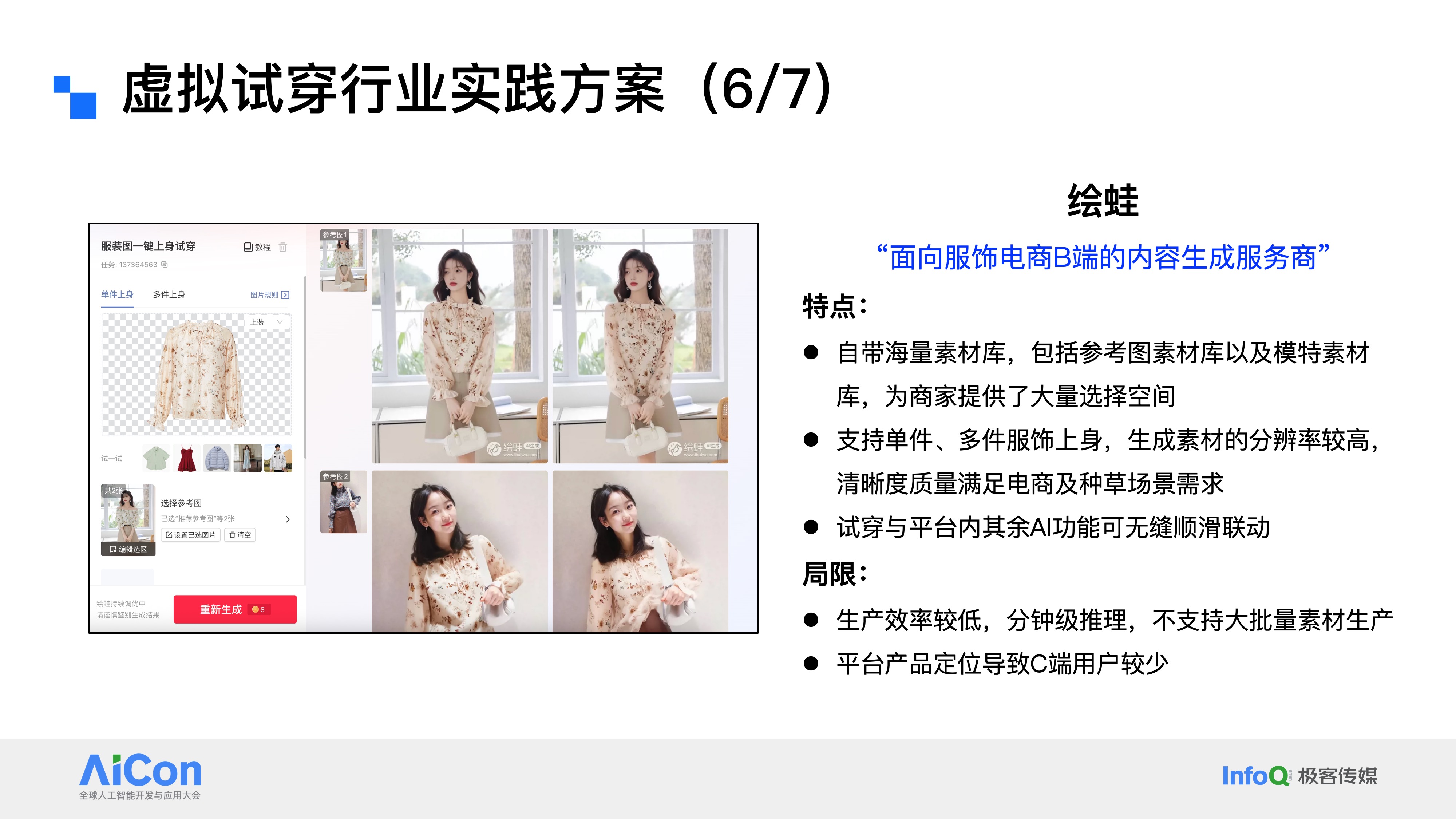 第二个是AI模特。模特图生成技术正逐步在头部品牌中批量落地,我们过去已与Nike、阿迪达斯、海澜之家三大时尚品牌达成深度合作。在批量应用阶段,合作品牌的商品转化率提升29%,商品上架速度提升90%,同时商品素材制作成本大幅下降。大家现在在这些品牌店铺里看到的部分模特图,正是由我们的AIGC技术生成,再结合虚拟试穿能力完成服饰上身的。