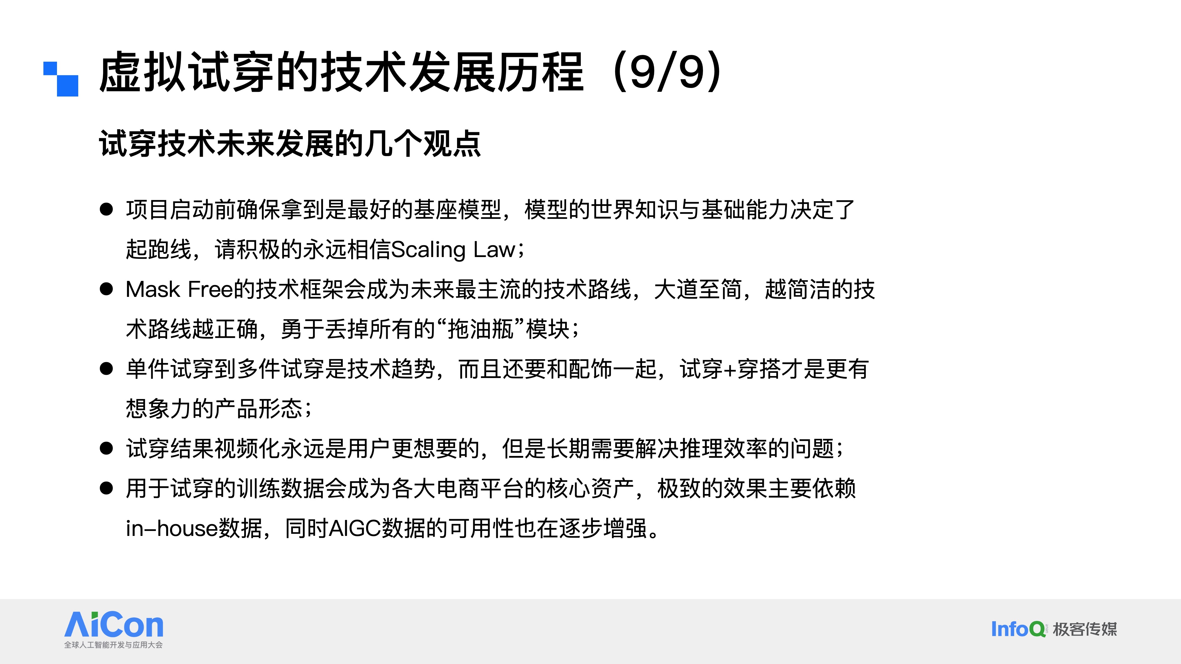 五是数据的价值,用于试穿的训练数据,会成为各大电商平台的核心资产。极致的试穿效果,主要依赖于企业的in-house数据。我们都知道,数据是大模型的核心,虽然有些从业者为了凸显技术深度,会刻意回避甚至弱化数据的重要性,但事实就是如此。尤其是虚拟试穿这类赛道,每个企业都会建立自己的数据壁垒。同时,随着AIGC能力的提升,模型训练早期可以借助AIGC数据快速收敛到任务需求,后续再用真实数据校正,就能有效规避AIGC生成内容带来的失真。