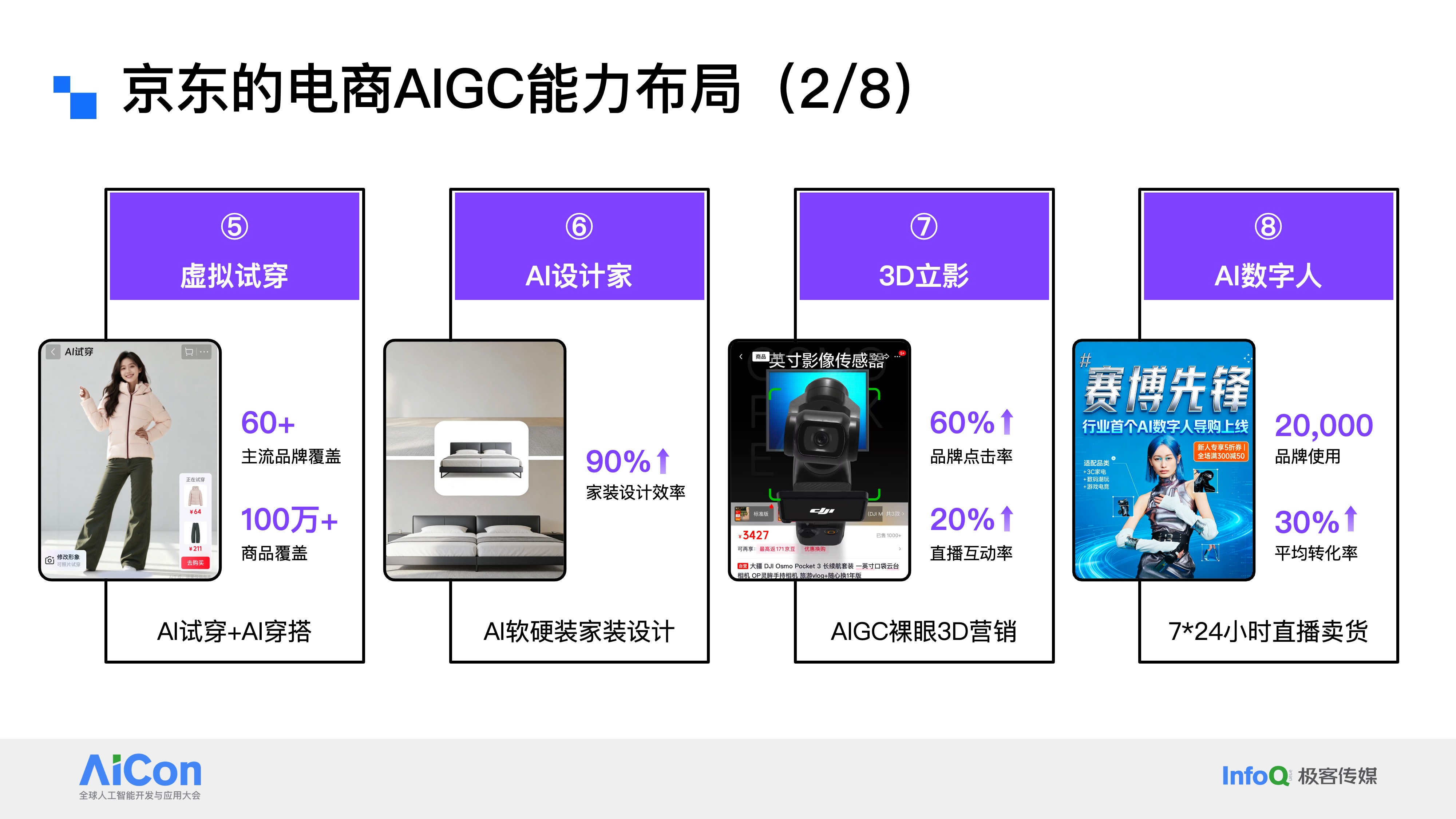 第五,虚拟试穿。这项能力不过多赘述了,今天的分享主题基本都围绕它展开,核心是通过AIGC技术实现服饰的虚拟上身与搭配,降低用户决策成本。第六,AI设计家。也可以称之为“放我家”功能,主要服务于家具等大件商品场景。用户上传自家房屋照片后,AI就能将目标家具植入到真实家居环境中,直观呈现摆放效果;同时还能针对毛坯房、清水房,按照用户需求设计出对应的装修风格,解决家居选购与装修设计的可视化难题。第七,3D立影。这是京东零售自研的AIGC裸眼3D技术,能让商品从商卡中“跳脱”出来,以3D形态呈现。这项技术能显著提升品牌商品的点击率,以及直播场景下的用户互动率。第八,数字人。相信大家对京东数字人并不陌生,目前已有超2万个品牌在使用这项能力,相关场景的转化率提升了30%。它最直接的价值是实现7×24小时数字人直播卖货,打破传统直播的时间限制,持续为商家创造收益。