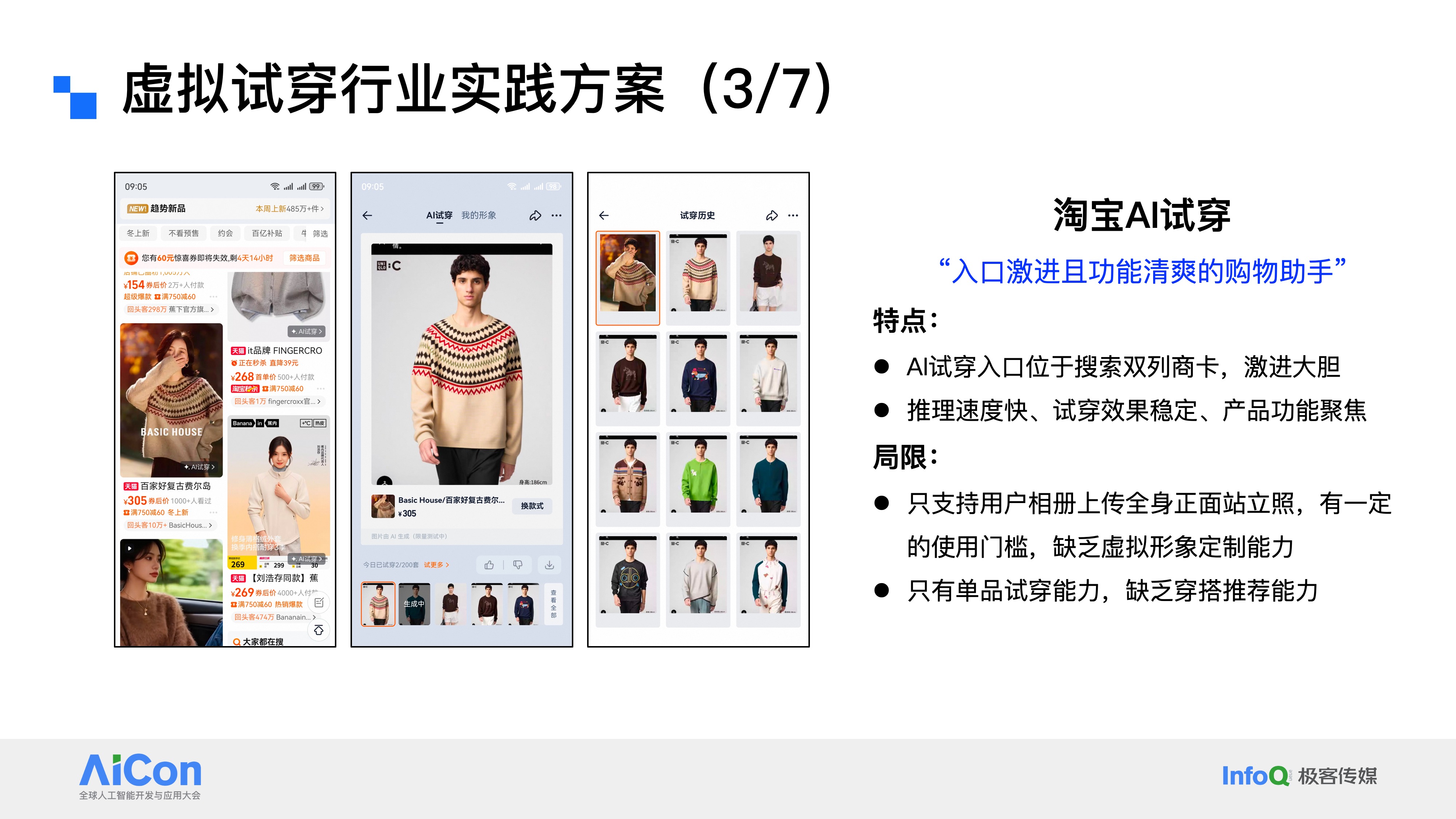 一是最左侧图示,商详主图的试穿入口,目前这个入口的设置比较保守,没有像淘宝AI试穿那样直接嵌入搜推双列商卡,我们认为在实验阶段,还是尽量避免影响用户原有的购物体验,后续会根据测试效果考虑提升入口优先级。