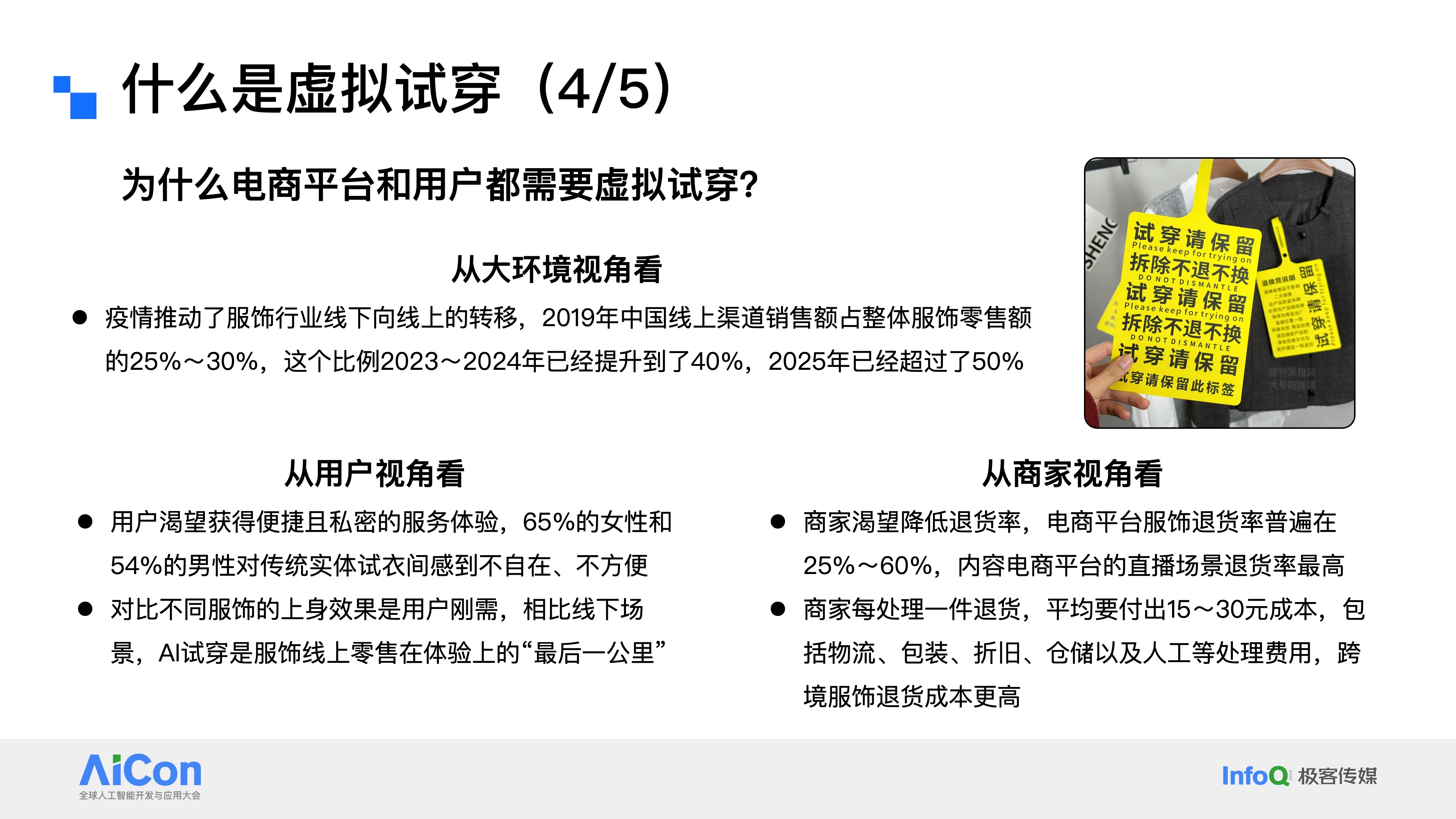 从商家视角来看,高退货率是服饰电商的核心痛点。这里有一张图,可能经常网购的女生会了解这个梗,现在有不少买家会做“穿完即退”的操作,尤其是礼服类服饰,穿着新衣服拍照打卡、出席活动后,就无理由退货,导致衣服沾染污渍异味,商家根本无法二次销售。为此,商家想出了用“大尺寸+硬质材料”的“巨型吊牌”,来对这种恶意退货进行物理防御。抛开这个梗不谈,普通电商平台的服饰退货率普遍在25%~60%,内容电商直播场景的退货率更高,部分可达80%~90%。商家每处理一件退货,平均需付出15~30元成本,涵盖物流、包装、折旧、仓储及人工处理等环节,跨境电商业务的成本则更高。此外,“穿完即退”等恶意退货行为也加剧了商家损失,因此行业亟需稳定、可靠的线上试穿技术与产品能力解决上述问题。