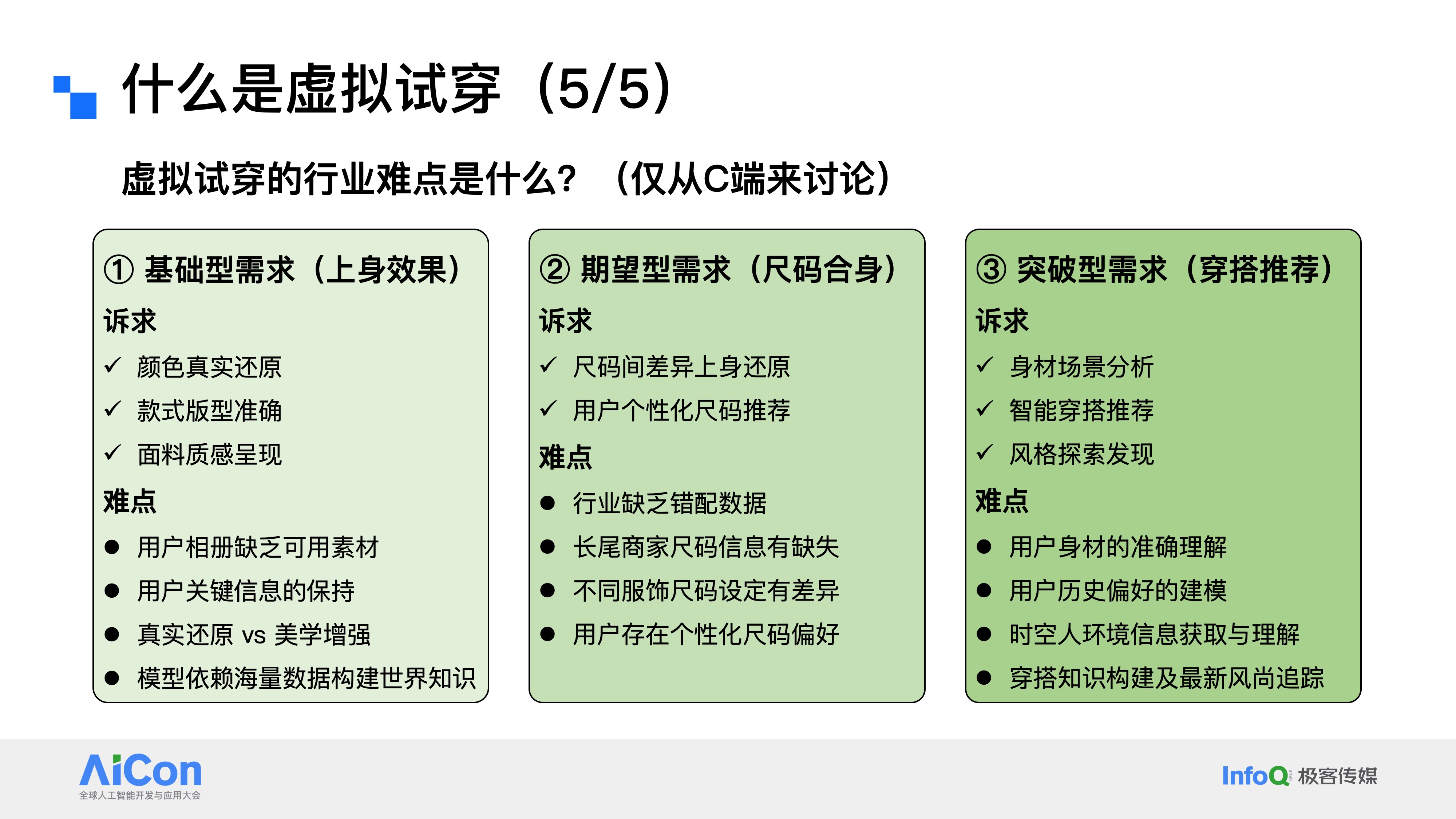 第二层是尺码合身需求,这是大众认知里,虚拟试穿最核心的刚需,也是目前实现难度最高的需求,行业内尚无成熟技术方案。从算法层面看,核心瓶颈是尺码错配训练数据的极度匮乏——电商平台买家秀多为合身尺码展示,缺乏“小体型穿大码”“大体型穿小码”等这类尺码mismatch的完整数据;此外,大量长尾服饰本身存在尺码信息缺失问题,不同品牌、品类的尺码标准不统一,这也是为什么有些店家会建议用户拍大一码或拍小一码。并且,用户对尺码存在个性化偏好,有人偏爱宽松的大码版型,有人则更倾向于合身的小码版型。所以说,尺码合身这个需求,是目前虚拟试穿技术实现中最大的难题,这进一步提升了实现难度。
