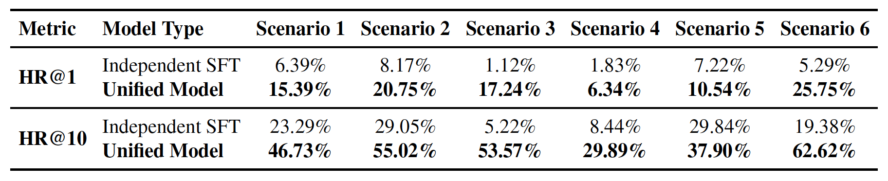- 统一模型 vs. 独立模型:在六个核心场景的对比中,统一的OxygenREC模型全面超越了为每个场景独立微调的基线模型,验证了OxygenREC框架在场景间正向迁移的有效性。