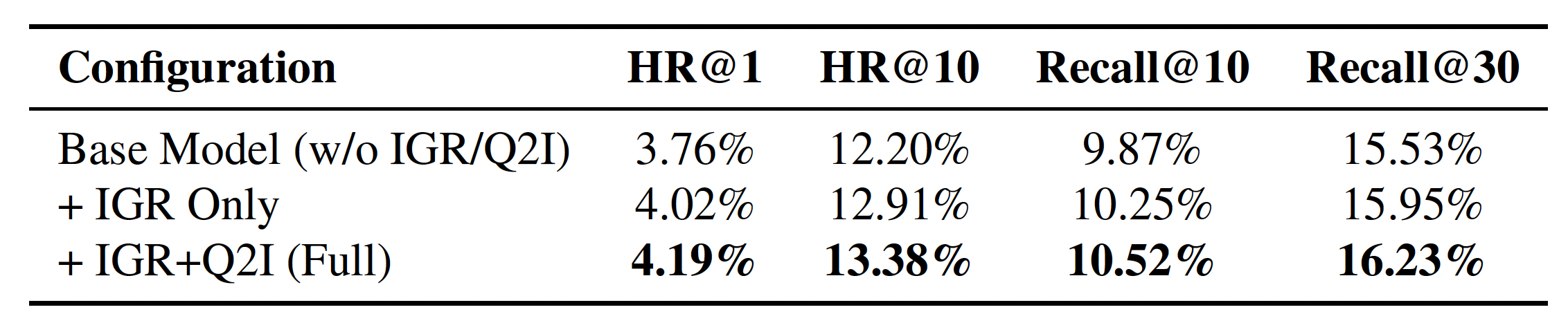 - 指令跟随:消融实验证明,在BOS右侧插入指令的方式为最佳;融合了场景ID和触发物品ID的指令效果显著优于单一组件;IGR和Q2I对齐机制共同作用带来了显著的性能提升。