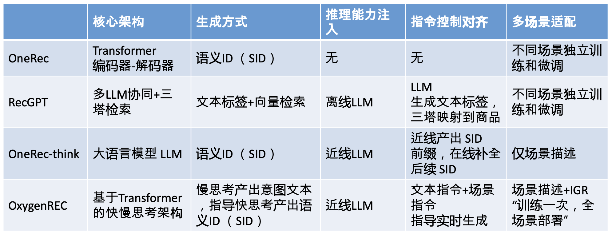 OxygenREC 在几个关键维度上进行了生成式推荐的范式革新: