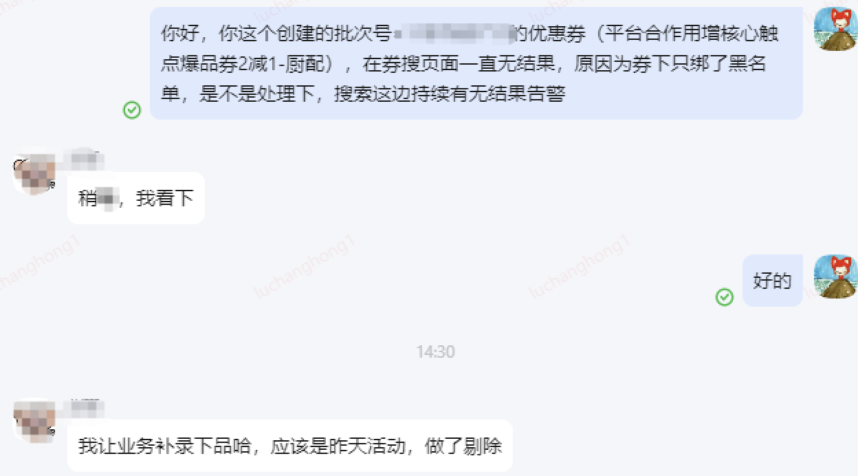 目前收到券促无结果告警,原因跟业务操作有关时,以私聊的方式去通知,效率较低,基于此创建券搜无结果周知群,线上单张无结果券促超过阈值时,自动获取对应业务erp并拉入群,推送告警信息,研发测试在群内做相关解答。