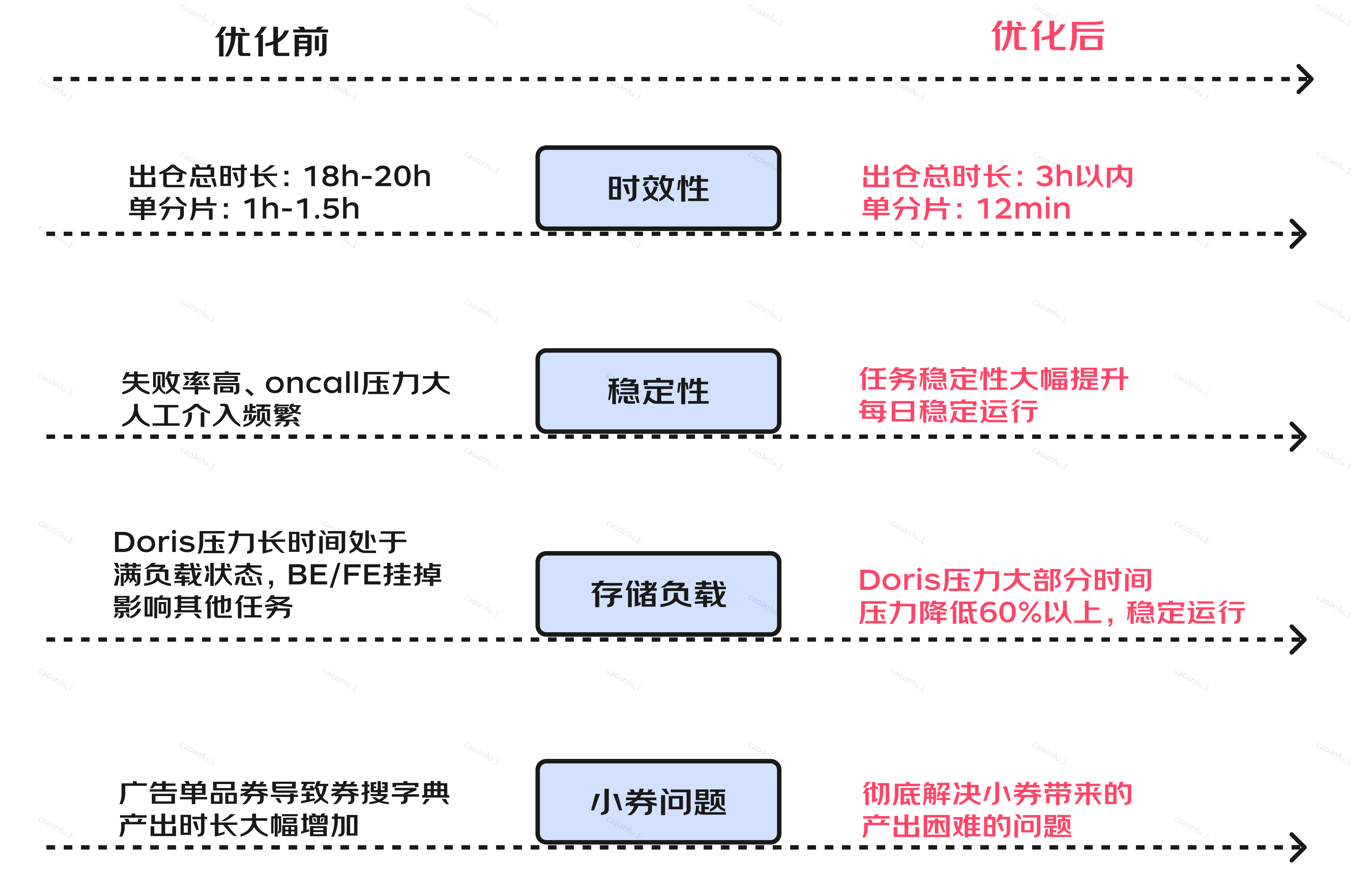 - 时效性:优惠券searcher、zsearcher单分片耗时从平均1h降低至12min,券搜字典出仓任务耗时由20h降低至3h以内,产出时效提升85%以上。