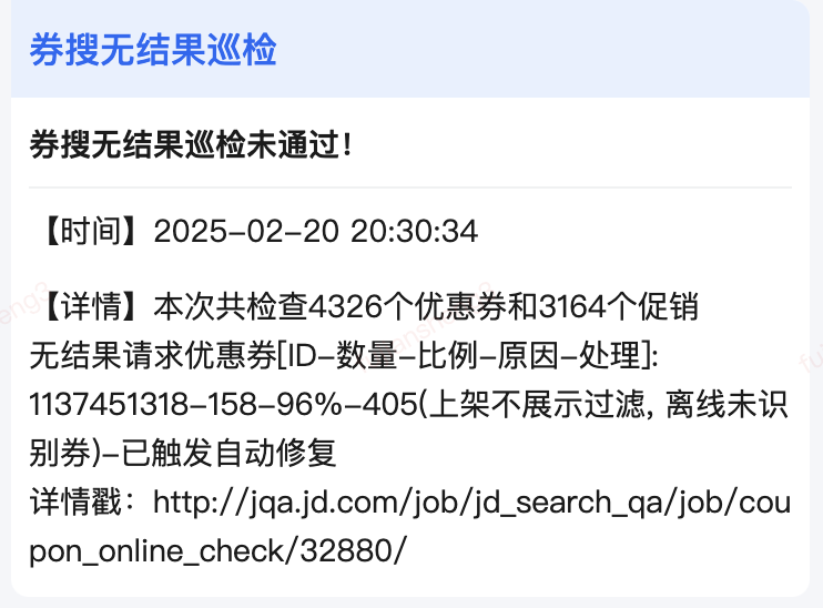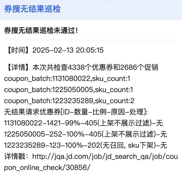 - 自动化巡检:定时巡检,将线上券促无结果及时发现