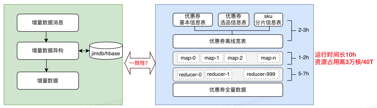 - 全量需要进行宽表join及数据聚合等操作,运行时间长10h,资源消耗高3万核/40T,严重阻碍了业务迭代速度