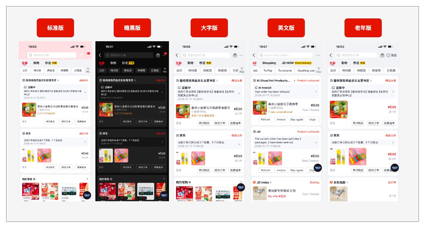 在订单模块的一码三端改造过程中,构建了一个基于实际工程代码的多模式适配体系,以满足不同终端和用户群体的多样化需求。京东App多模式适配场景非常丰富,涵盖多语言适配、暗黑模式、大字版、老年版、大屏横屏模式、换肤主题、无障碍访问等多个方面。每一个适配场景都需要业务开发团队投入大量精力进行适配和优化,确保在不同设备和用户偏好下,依然能够提供稳定、流畅、友好的用户体验。