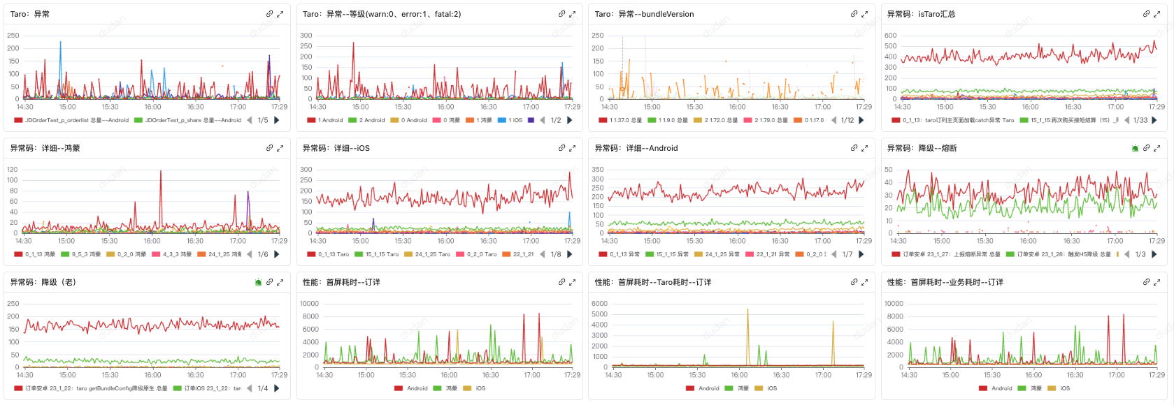 监控包含多维度覆盖,首屏耗时、接口耗时、白屏、Taro异常、Bundle下载、业务异常等关键指标。通过烛龙性能监控(监控首屏耗时、接口响应时间等关键指标)、自定义错误码上报(精准定位业务异常)、网络接口耗时监控(识别性能瓶颈)等手段,实现了对业务全链路的实时监控和预警。为快速发现和解决问题提供了有力支撑。