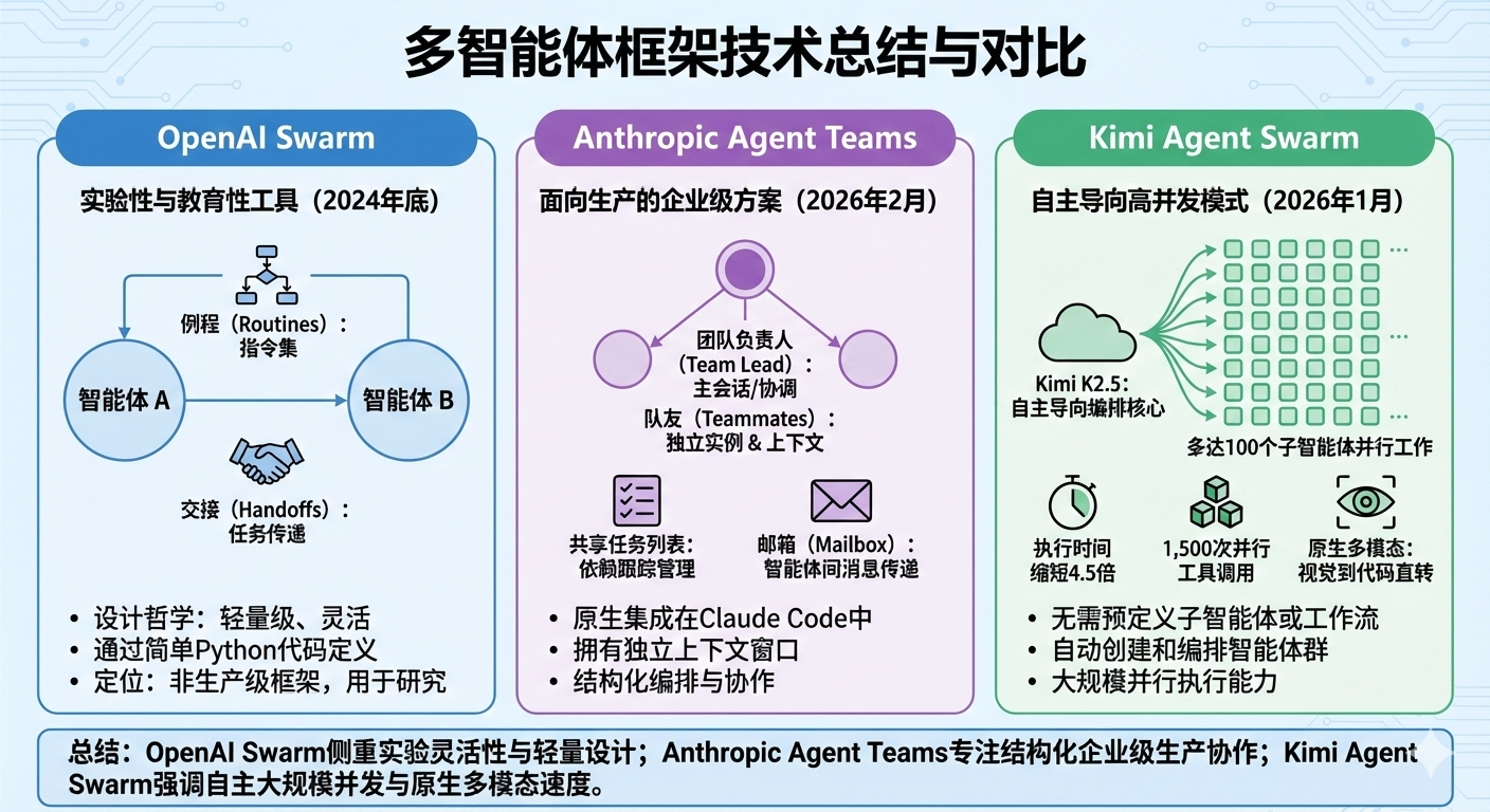 随着AI Agent技术的快速发展,OpenAI、Anthropic和Kimi等厂商都在2025-2026年间推出了各自的智能体团队解决方案,它们的核心理念和实现方式各有特色。