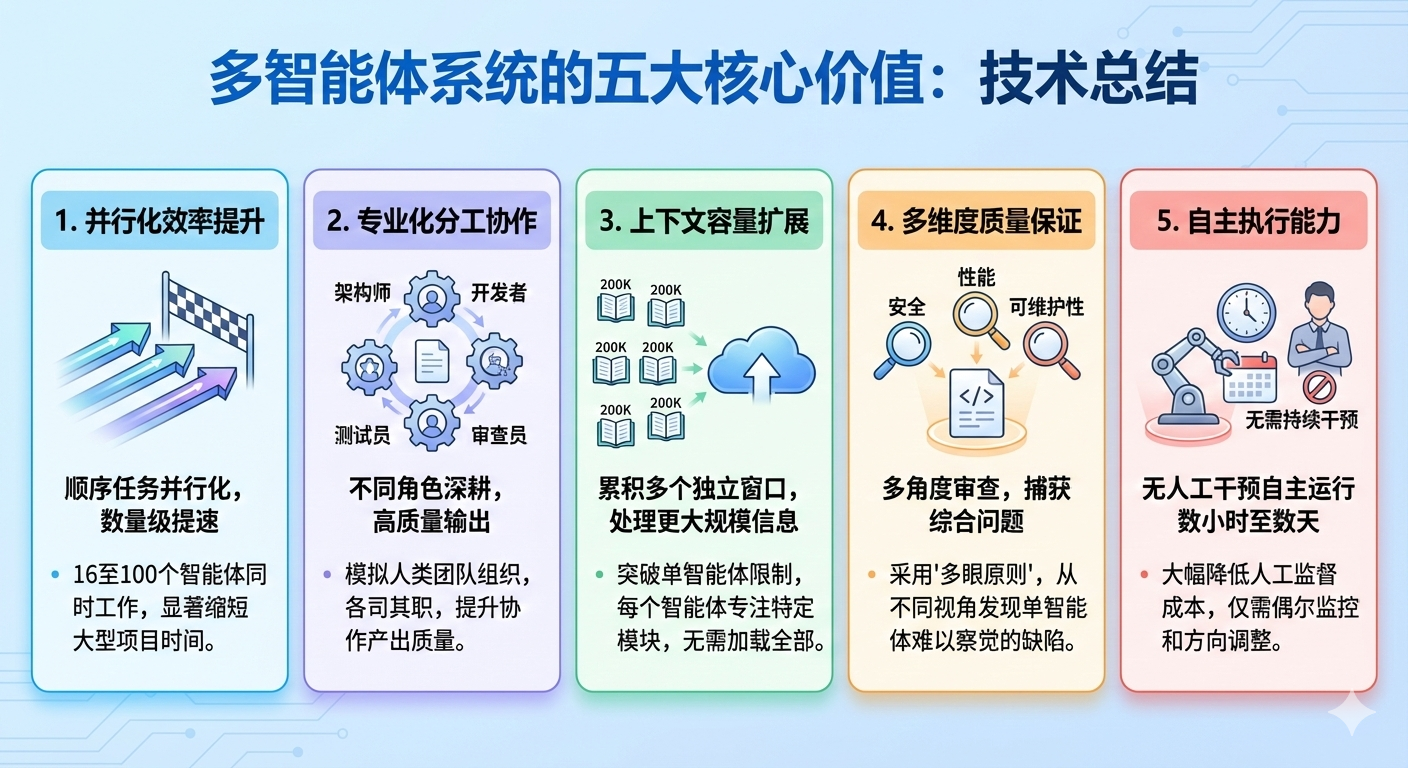 智能体团队最直观的价值在于将原本顺序执行的任务并行化。Anthropic的C编译器项目展示了16个智能体并行工作的威力,而Kimi K2.5更是将这一能力扩展到100个智能体。对于可以分解为独立子任务的大型项目,这种并行化能够带来数量级的效率提升。
