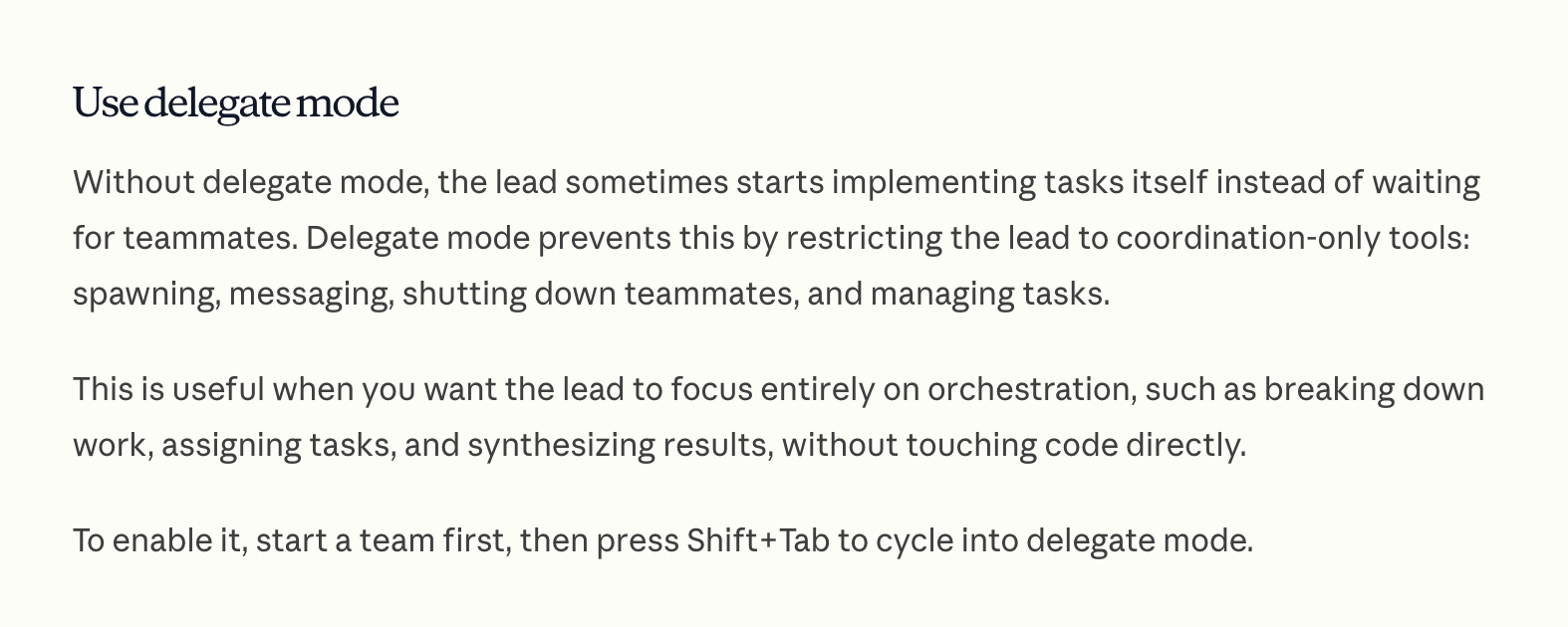 在委派模式下,团队负责人仅限于协调工具(生成、消息、关闭队友、管理任务),不直接触碰代码。这对于希望负责人专注于编排而非实现的场景非常有用。按Shift+Tab可循环进入委派模式。