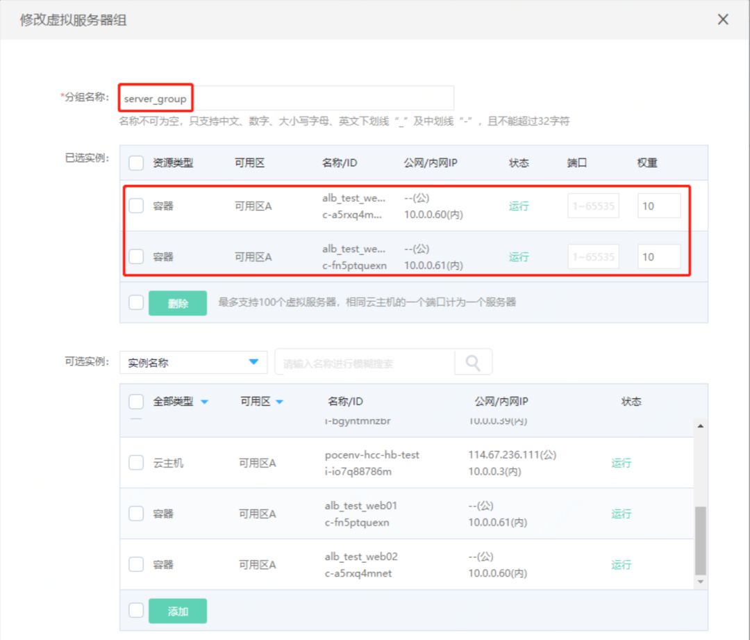 我们将原来的2台弹性伸缩生成的云主机删除,然后将上面创建的2台原生容器加进来,然后点击确定