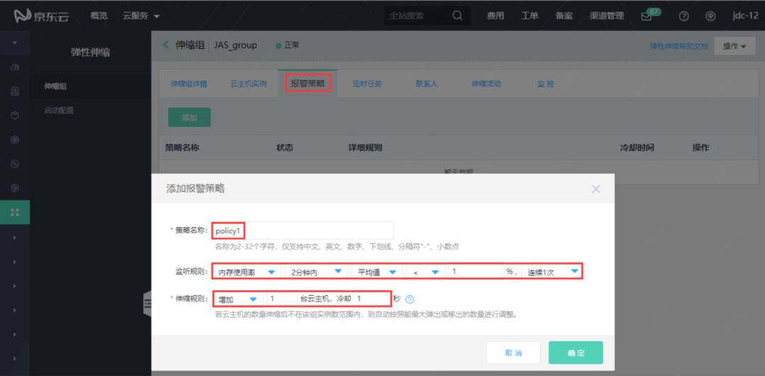 我们在伸缩组中的报警策略页面添加策略,配置如下: