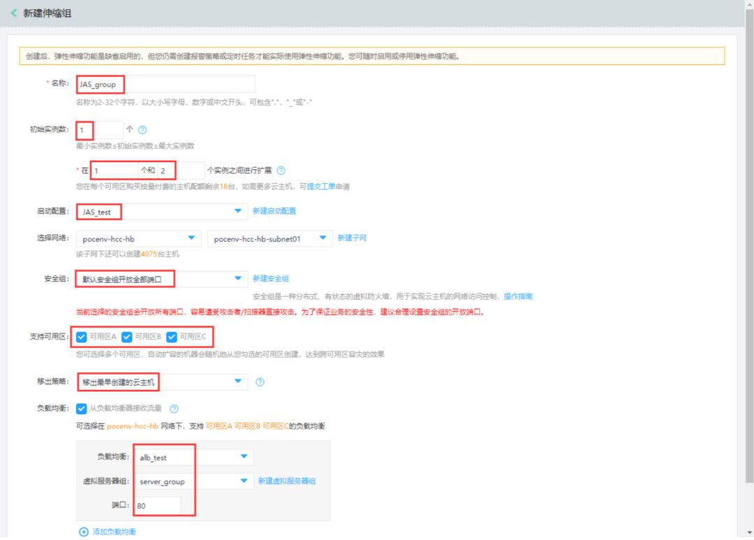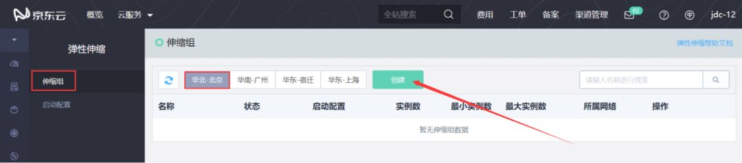 完成启动配置的创建后,左侧点击伸缩组,同样在华北-北京区域创建伸缩组,配置信息如下: