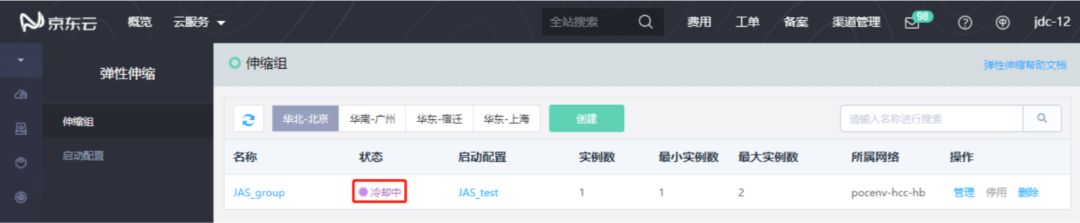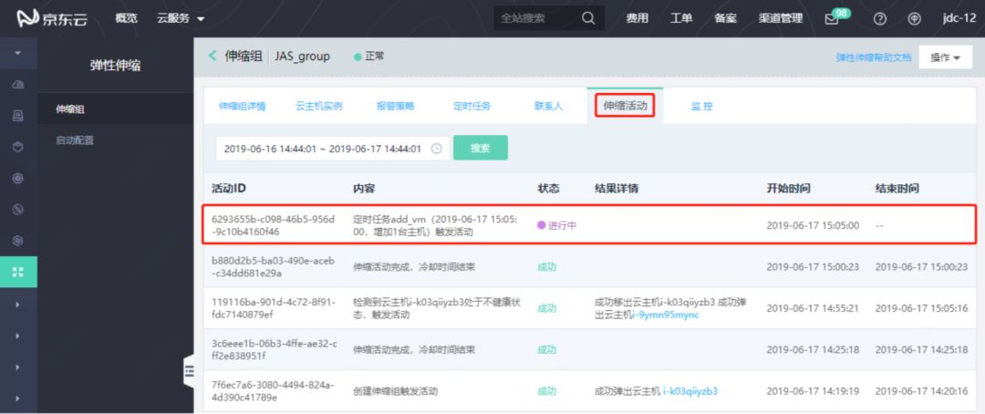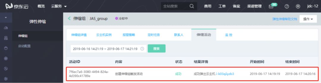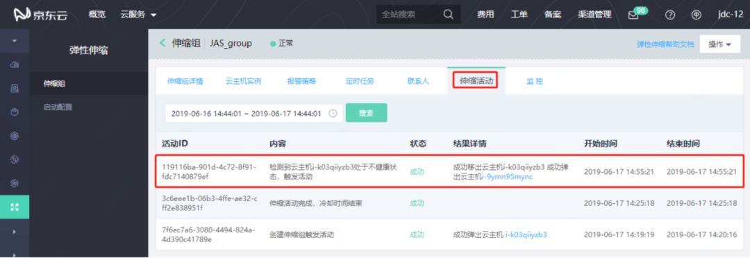 我们在找到伸缩组JAS_group,在伸缩活动页面查看伸缩动态,发现由于我们停止云主机导致检测不健康而被移除,并成功创建了新的云主机