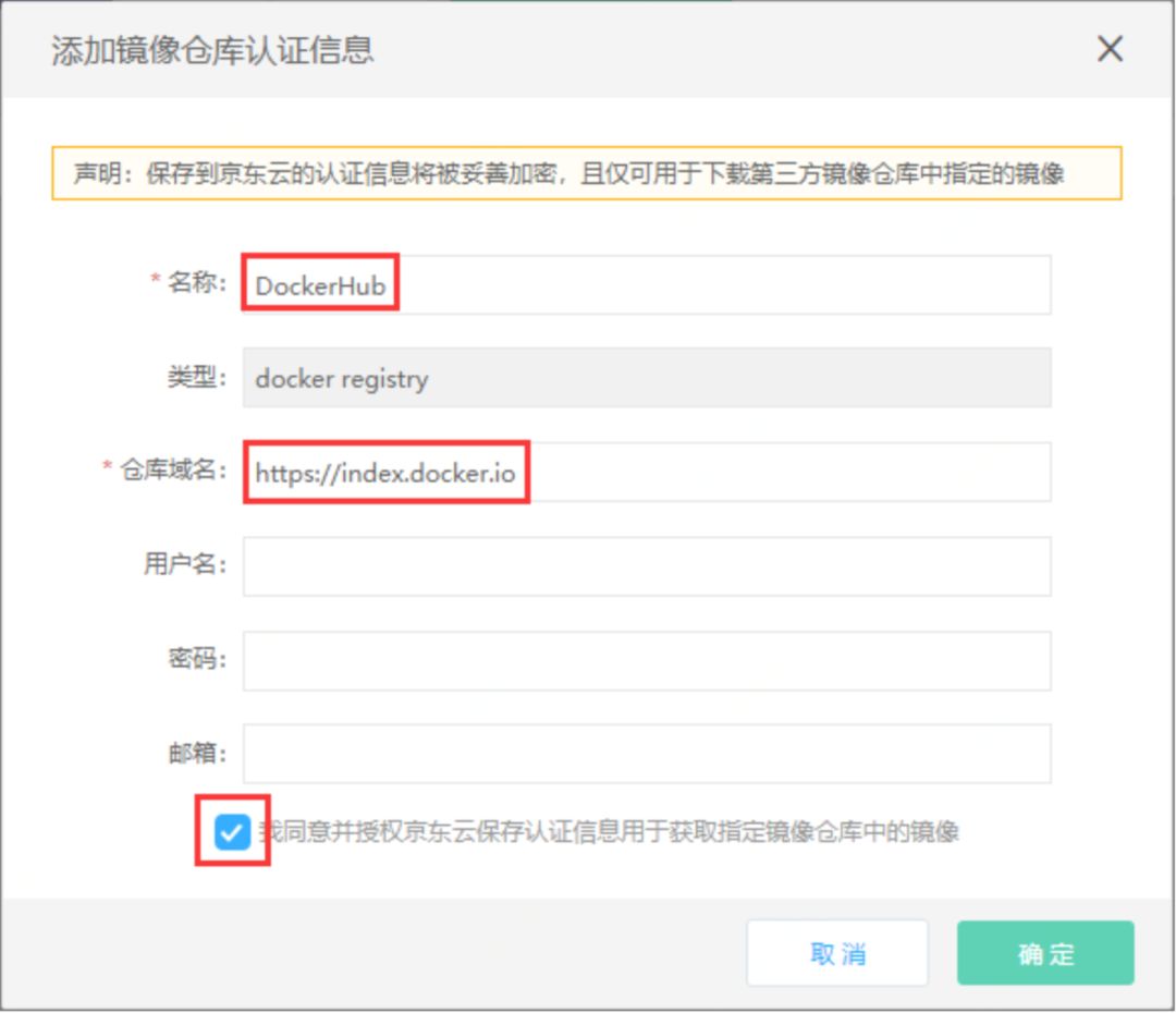 这里运用自定义的DockerHub公共仓库镜像,我们需要点击控制台左侧弹性计算-原生容器-镜像仓库认证信息-华北-北京-添加镜像仓库认证信息,配置如下: