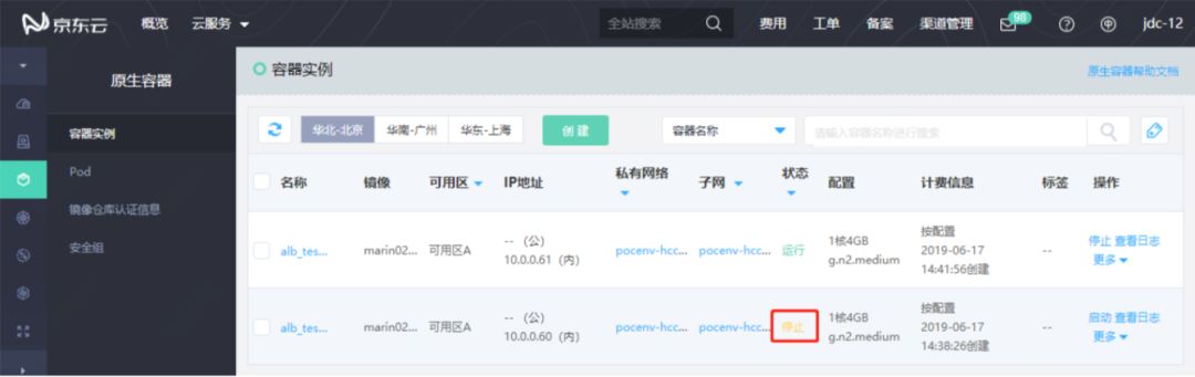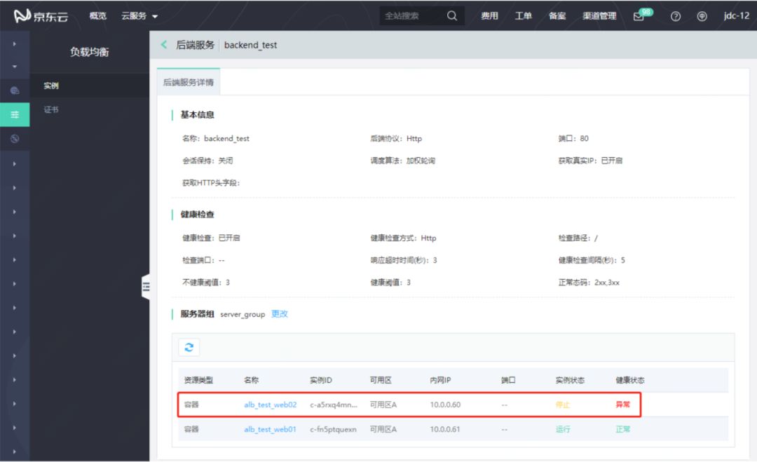我们将负载均衡虚拟服务器组中对应的任意一台原生容器停止,用以模拟服务器故障