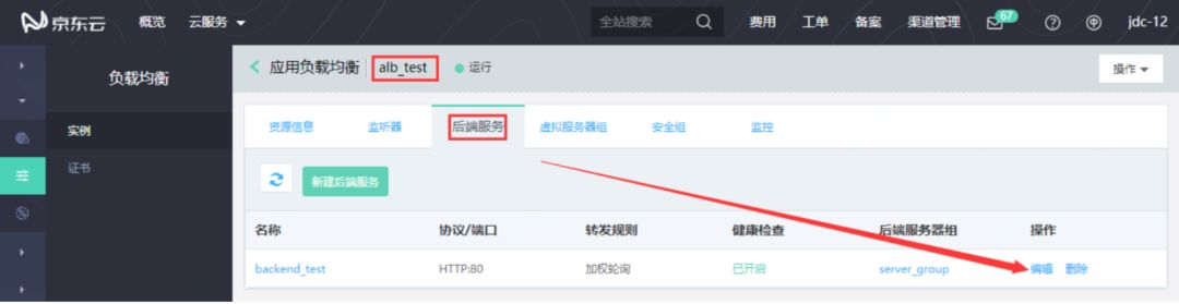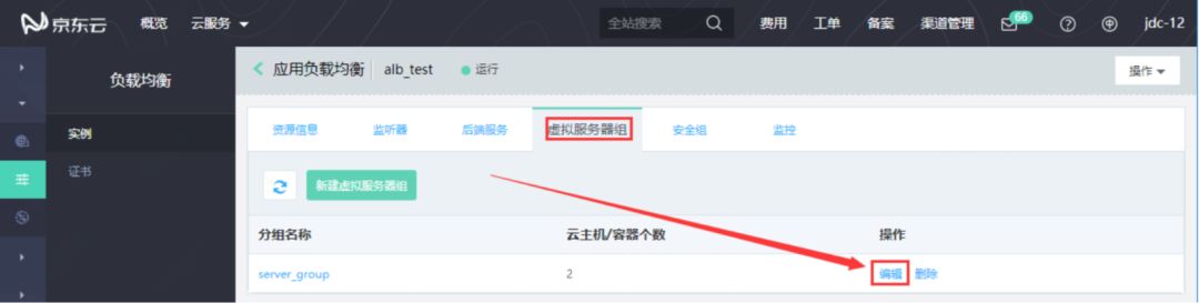 在负载均衡实例控制台找到我们上面新建的负载均衡实例alb_test点进去,在虚拟服务器组里我们编辑上面我们新建的服务组server_group