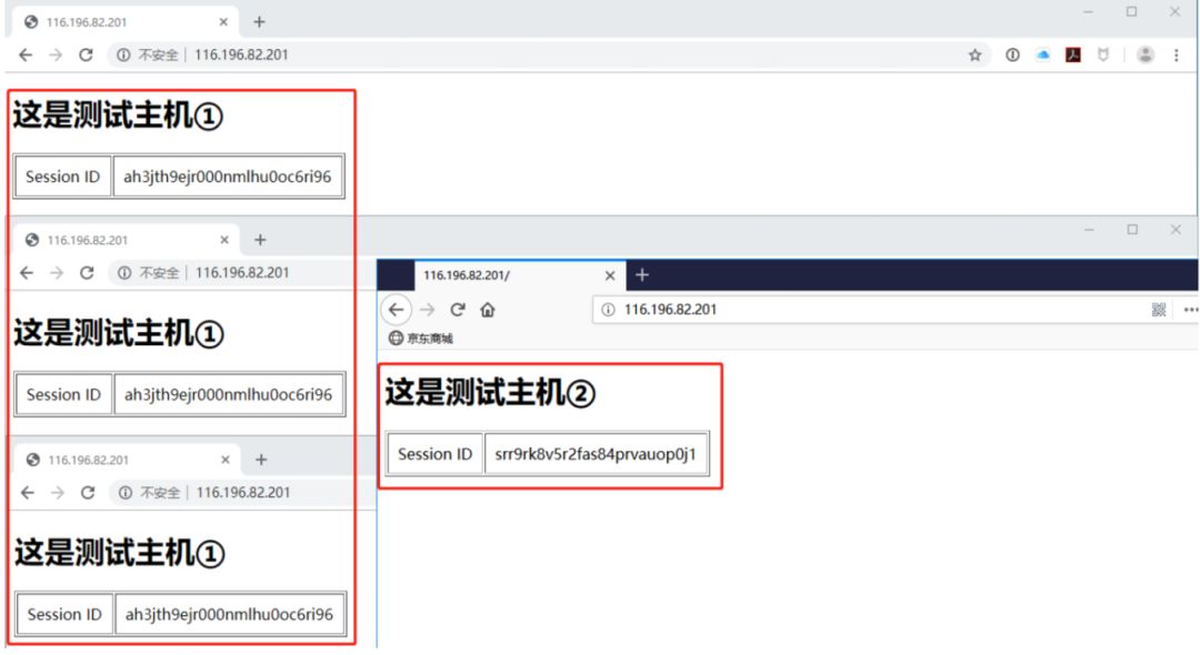 我们打开3种不同的浏览器(谷歌、火狐、Microsoft Edge)分别访问负载均衡,当第一个浏览器请求被分配到某一台后端机器的时候(我这里是原生容器①),其他的浏览器请求也都会被分配到这台机器