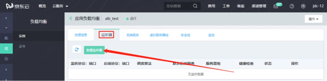 在新建的负载均衡实例alb_test上添加一个HTTP协议的监听器,如下图点击监听器-新建监听器: