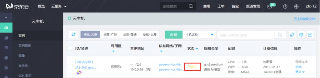 脚本执行完成后,我们开始制作镜像,在云主机实例控制台找到我们创建的云主机将其停止
